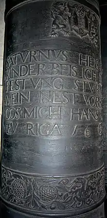 Johann (I), also called Hans, died in 1610. He must have spent time, possibly part of his journeyman years, in Lübeck. This can be derived from a dispute he had with the guild in Lübeck, when he was already in Riga. The guild accused him of having poached assistants from his colleagues there.[7] He seems to have been for some time in military service as in the abovementioned dispute his first wife was pejoratively referred to as a soldiers’ moll (öffentliche Haerhure).[8] The high-tech knowledge and skill of cannon-casters was constantly needed in the army. After years of travel in military service Hans Meyer came to Riga, at the time a German-speaking town, to become assistant to the caster to the City Michel Baier. Before 1582 he took over Baier's workshop and was appointed his successor in 1585.[9] Meyer was in permanent scuffle with the Riga guild and became a member only in 1594.[10] The inscription on a bell he made for St. Peter's church in 1585 is a testimony of this difficult circumstances: "In Gottes Namen hat mich Hans Meyer gegossen, das hat manigen verdrose" (In the Name of God Hans Meyer cast me, which did annoy some people).[11] Hans died in 1610.[12] He left behind his second wife Catarina Bordinck and at least three underage children.[13] Catarina continued to run the workshop until around 1612 when it was taken over by Medardus Gessus (Gesus, Gisus) from Constance whom she possibly married.[14] Hans Meyer is said to have been the best caster ever active in Latvia.[15] Some of his cannons (called “Buchse” in 16th century German) are still preserved.[16]