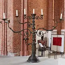 The first member of the Meyer family linked with the Swedish capital is Gerhardt (I): "Me fecit Gerhardt Meyer Holmiae" – Holmia is the Latin name for Stockholm – is the caster's signature on a bronze sculpture of a Bathing Venus (1597).[34] In the years 1592-1595 a Gärt (Gerhardt) Meyer is documented in Stockholm.[35] He seems to have left the Swedish capital in 1596 by moving to Riga, where he was briefly active in Hans Meyer's workshop. Hans and Gerhardt must have been close relatives. Under Hans Meyer as head of the foundry, Gerhardt must have cast the monumental candelabrum for St. Peter's church.[36]