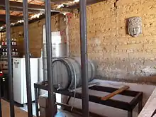 The process begins by harvesting the plants, which can weigh 40 kg (88 pounds) each, and extracting the piña, or heart, by cutting off the plant's leaves and roots.[12] The piñas are then cooked for about three days, often in pit ovens, which are earthen mounds over pits of hot rocks. This underground roasting gives mezcal its intense and distinctive smoky flavor.[5][8] They are then crushed and mashed (traditionally by a stone wheel turned by a horse) and then left to ferment in large vats or barrels with water added.[12]