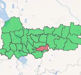 Mezhdurechensky District (Russian: Междуре́ченский райо́н) is an administrative[1] and municipal[7] district (raion), one of the twenty-six in Vologda Oblast, Russia. It is located in the center of the oblast and borders with Sokolsky District in the north, Totemsky District in the northeast, Soligalichsky District of Kostroma Oblast in the southeast, Gryazovetsky District in the south, and with Vologodsky District in the west. The area of the district is 3,600 square kilometers (1,400 sq mi).[4] Its administrative center is the rural locality (a selo) of Shuyskoye.[3] District's population: 6,112 (2010 Census);[5] 7,641 (2002 Census);[9] 9,361 (1989 Census).[10] The population of Shuyskoye accounts for 36.8% of the district's total population.[9] As of 2010, Mezhdurechensky District had the lowest population among all the districts of Vologda Oblast.