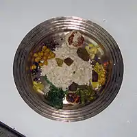 The mandala is a sandpainting made with powdered limestone. The Mha Puja mandala is drawn in the shape of an eight-petalled lotus inside a circle marked with water. It can be drawn freehand or by using a stencil or mould. At the center of the mandala, a small circle is drawn with mustard oil. This is surrounded by concentric rings marked with red rice, black lentil, black soybean, unhusked rice and puffed rice as per family tradition.[8]