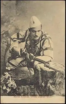 Milan Aleksić (Serbian Cyrillic: Милан Алексић), nicknamed Miša (Миша), known by his nom de guerre Marinko (Маринко), was a Serbian Chetnik active from 1905 to 1918.[1] He was born in Raška, at the time part of the Ottoman Empire.[1] He fled Ottoman tyranny to Kuršumlija, in the Kingdom of Serbia,[1] where he graduated from the Military Academy as a non-commissioned officer.[1] He joined the Serbian Chetnik Organization in 1905, fighting under Jovan Babunski and Gligor Sokolović in Poreč and on the Babuna against Bulgarian and Albanian bands.[1] He was an assistant of the Upper Staff of Panta Radosavljević-Dunavski, Nikola Janković-Kosovski and Pavle Blažarić as a non-commissioned officer. In 1908, he worked with Vojislav Tankosić in training volunteers in Bosnia.[1] He is regarded a hero in all wars between 1912 and 1918, during which he had the rank of lieutenant colonel.[1] He wore an Albanian costume during battle in order to confuse the enemy.[1] He died of exhaustion in Veliki Bečkerek (modern Zrenjanin), in Banat, on May 27, 1923.[1]