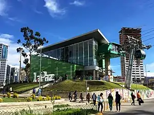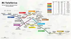 Mi Teleférico (Spanish pronunciation: [mi teleˈfeɾiko], English: My Cable Car), also known as Teleférico La Paz–El Alto (La Paz–El Alto Cable Car), is an aerial cable car urban transit system serving the La Paz–El Alto metropolitan area in Bolivia.[6] As of October 2019, the system consists of 26 stations (36 if transfer stations are counted separately per line) along ten lines: Red, Yellow, Green, Blue, Orange, White, Sky Blue, Purple, Brown, and Silver. Further lines and extensions are in planning or construction.[2]