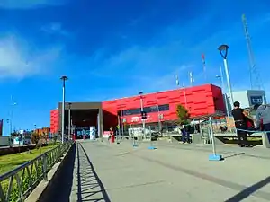 Mi Teleférico contributed to the construction of the Teleférico Turístico "Virgen del Socavón" (Our Lady of the Mines Tourist Cable Car) in Oruro, Bolivia. The cable car connects the city center to the Virgen del Socavón statue and shrine on nearby Santa Bárbara hill, which plays an important role in the city's carnaval celebrations. The cable car, which opened on 7 February 2018, consists of a single 800-metre (2,600 ft) line with two stations and 16 cars. It has a capacity of 1000 passengers per hour, and a one-way trip takes approximately 3 minutes.[26][27] The project was originally due to open in November 2016, but it suffered repeated delays until Mi Teleférico took over construction work in 2017.[28]