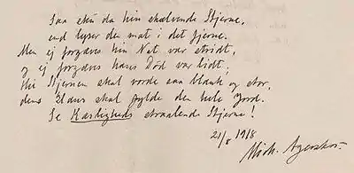 Michael Agerskov (1870–1933) was a Danish spiritualist teacher and author, best known for his book, Toward the Light, which he co-authored with his wife Johanne Agerskov. Agerskov's literary production includes poems, novels, and also schoolbooks for the primary school and the secondary school in Denmark. Together with Erling Rørdam he also wrote a reader, published several times during 1904 and 1933, and also translated into Swedish.