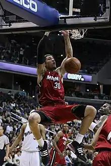 During the 2009–10 season, he was a starter for the entire season. On February 19, 2010, he led the Heat to victory over the Memphis Grizzlies with a then career-high 30 points along with 8 rebounds.[40] For the season, he averaged 14.8 points per game and 6.4 rebounds per game. In the Heat's first-round playoff series loss to Boston, those averages declined to 10.4 and 5.8, respectively.[41]