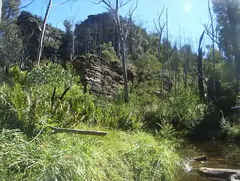 Hanging swamps are an interesting feature of the Reserve and are defined not only by the unique plant life - sedges, grasses and shrubs - but also by the underlying geology. Layers of sandstone, claystone and shale direct groundwater to exit points on the valley walls, which feed the swamps on a continuous basis. These hanging swamps are the source of water for creeks and waterfalls in the upper Blue Mountains. In this Reserve, Katoomba Creek flows downstream into the World Heritage Site of the Grose Valley.