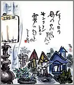 Hofmann’s worldwide wanderings reminded Jikihara of the mendicant, eccentric, sake-loving Zen monk Santoka Taneda (1882-1940) and he suggested they do a series of works based on the monk’s haiku. The 1988 Osaka exhibition of Hofmann’s 30 brush paintings, with Jikihara’s calligraphic rendering of the haiku interwoven into them was the first collaborative exhibition by master and student.[4] They later exhibited work together at the Gyokusei Museum, Awajishima[5] and at the Hakusa Sonso Villa in Kyoto. Toward the end of Jikihara’s life, Hofmann worked with him on large murals, often painting areas toward the top that his elderly teacher could no longer reach.[6] Hofmann also collaborated and exhibited Shigajiku, with Fukushima Keido,[7] the abbot of Kyoto’s Tofukuji Temple[8]