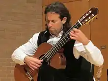 Michael Nicolella (born December 31, 1963 in Providence, RI) is an American classical guitarist and composer. Described as an iconoclast,[1] he is known for his versatile, adventurous and eclectic approach to repertoire, including the incorporation of electric guitar into his concert programs and recordings.[2][3][4] Nicolella's repertoire ranges from the Baroque to the present. His most recent recording is his own arrangement of the complete cello suites of Johann Sebastian Bach; while his past four recordings focused on contemporary music, including his own compositions, alongside those of Toru Takemitsu, Elliott Carter, Luciano Berio, Hans Werner Henze and Steve Reich. He has championed music by such emerging composers as Laurence Crane and Jacob ter Veldhuis and has premiered many works written for him by other composers, including: Joshua Kohl, (of the Degenerate Art Ensemble), David Mesler, Christopher DeLaurenti[5] and John Fitz Rogers, who in 2001 wrote the forty-five-minute piece Transit for Nicolella, scored for electric guitar and computer generated sound.[6] His own compositions include works for solo guitar, chamber music with guitar, a classical guitar concerto (Guitar Concerto), and an electric guitar concerto (Ten Years Passed). His most recent major composition for soprano, guitar (electric and classical) and orchestra, The Flame of the Blue Star of Twilight, was premiered by the Northwest Symphony Orchestra and soprano Alexandra Picard in April 2012. He has performed and collaborated with a wide range of groups and artists including: violinist Gil Shaham,[7] rock singer Jon Anderson, best known for his work as lead vocalist in the progressive rock band Yes,[8] broadway legends Bernadette Peters and Brian Stokes Mitchell, the Seattle Guitar Trio, jazz singer Johnaye Kendrick, classical music comedians Igudesman and Joo and is a frequent guest with the Seattle Symphony. Nicolella is a graduate of Yale University, Berklee College of Music and the Accademia Musicale Chigiana. He is currently based in Seattle, where he serves on the music faculty of Cornish College of the Arts.[9] He is married to the painter Ann Gale.