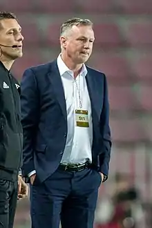 O'Neill initially continued as Northern Ireland manager after his appointment by Stoke City in November 2019.[37] He had intended to stay on for UEFA Euro 2020 playoffs, which had been scheduled for March 2020, but these were postponed by the COVID-19 pandemic.[38] With the Euro 2020 playoffs delayed at least until the autumn of 2020, O'Neill resigned as Northern Ireland manager on 22 April.[38]