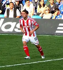 On 4 September 2012, Owen joined Stoke City on a one-year contract.[123] He was handed the number 10 shirt from the departed Ricardo Fuller and made his debut in a 1–1 draw against Manchester City on 15 September.[124] The start to his time at Stoke was hampered by a hamstring injury.[125] Owen scored his first and only goal for Stoke on 19 January 2013 in a 3–1 defeat at Swansea City, his first goal since 25 October 2011. In doing so, he became only the seventh player to reach 150 Premier League goals.[126]