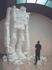 Around 2003, inspired by their "mechanical" shapes, Salter began using pre-formed styrofoam packing materials to construct a six-foot tall robotic sculpture.[12] Over time the Styrobots have grown with each successive show, expanding to fill their available space.[5] The tallest Styrobot to date was created for a group show at the San Jose Museum of Art in 2008, "Robots: Evolution of a Cultural Icon".[12] Rising to a height of 22 feet, the massive figure was surrounded by and appeared to be looking down at a number of smaller Styrobots at its feet.[12] Later that year, a solo show at Rice University titled too much featured a Styrobot nearly as large in a much smaller space, crouched in a defeated position in the corner, surrounded on all sides by walls plastered with scores of images culled from Salter's collection of graphic icons.[13]