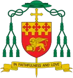 Fisher's coat of arms as an auxiliary referenced those of several past archbishops. The colors of red and gold were used in the coats of arms of archbishops Hickey, McCarrick, and Wuerl. The line embattled and red crosses reference the tower embattled and red cross in Wuerl's coat of arms. The lion, in addition to representing Fisher's patron saint, St. Mark, references the lion on Cardinal Hickey's coat of arms.[2]