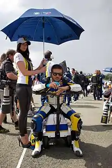 In 2008 he raced alongside Troy Bayliss for Ducati Xerox Team on the new Ducati 1098.[5] He came third in race one at Philip Island, Australia, despite a huge crash at the original start.[6] At Miller Motorsports Park, he qualified on the front row and took a pair of third places, despite dropping to eleventh on lap one of the first race.[7] He had a double-DNF at Assen, shortly before an arm operation, and finished a career-best 8th overall.