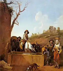 In his genre scenes Cerquozzi shows his indebtedness to the Bamboccianti, the circle of Dutch and Flemish painters around Pieter van Laer and Jan Miel who had developed a new style in Rome rooted in Northern traditions of genre painting. A painting in this style was known as a Bambocciata (plural: Bambocciate).[2] The important contribution of the Bamboccianti was the introduction to Roman painting of new subjects derived from Flemish and Dutch genre paintings including according to a contemporary source, "rogues, cheats, pickpockets, bands of drunks and gluttons, scabby tobacconists, barbers, and other 'sordid' subjects."[11]