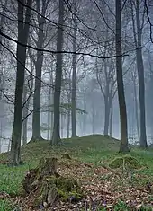 There is a linear earthwork running west–east across the wood. Nearby is a bowl barrow, 25 metres (82 ft) in diameter and 2 metres (6 ft 7 in) high, with a hollow left by antiquarian excavation; and a bell barrow, 23 metres (75 ft) in diameter and 1.8 metres (5 ft 11 in) high.[4]