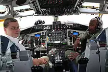 The prime minister of Latvia sits at the controls of a KC-135 Stratotanker along with an officer from the Michigan Air National Guard