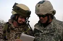A Latvian soldier and an Afghan soldier communicate during Operational Mentor and Liaison Team training at the Joint Multinational Readiness Center in Germany.