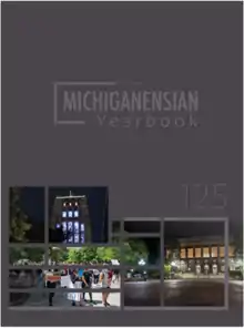 The Michiganensian is published yearly in late spring by a staff of several dozen students.[3] The book is the second oldest publication on campus, and it contains articles and original photography related to campus life, student activism, university athletics, and current events.