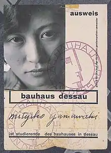 She was born in the 43rd year of the Meiji (era) in Tsukiji, a district of Chūō, Tokyo, as the oldest daughter of Zengoro Yamawaki, a Urasenke tea ceremony master.[1] She married photographer and architect Iwao Yamawaki in Japan in 1928; as she was a heiress and the eldest daughter of an important family, he was asked to adopt her family name, which he did - in exchange, the family financially supported both of their studies at the Bauhaus.[2] In May 1930 Michiko and Iwao left Japan for California and then New York, where they spent two months, before travelling to Berlin, where they were reunited with Koreya Senda, who had already been living in Berlin for about two years. Senda, a politically active socialist, was involved with underground theatre in Berlin, and with the Japanese artistic community in the city, which he introduced the Yamawakis to.