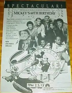 Mickey's 60th Birthday is a 1988 television special broadcast on The Magical World of Disney on November 13, 1988 on NBC.[1] As the title suggests, it was produced for the 60th anniversary of the Mickey Mouse character. Like Who Framed Roger Rabbit (which had been recently released at the time), much of the footage featured in the film is live-action with newly made animation (although some of the animation used for some scenes was made from existing footage) provided by Murakami-Wolf-Swenson. It was rebroadcast on Disney Channel Europe on November 18, 2008 to celebrate the 20th anniversary of the special, as well as Mickey's 80th birthday.