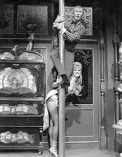 This half-hour musical variety series was co-hosted by Fred Finn (his real name) and his wife, Mickie Finn (a stage name). The music played by the house band (Tony "Spider" Marillo on drums, Stormy Gormley on tuba & cello, "Dimples" Bobby Jensen on left-handed trumpet, Owen Leinhard on trombone, and "Cugar" Nelson on trombone[2]) ranged from current hits to ragtime to Dixieland jazz. In addition to the guest stars, the regular cast included Fred as the proprietor who played piano, Mickie who played banjo, and the Dapper Dans, a barbershop quartet who also did comedy bits. Harold "Hoot" Connors and Mickey Manners were the bartenders and bouncers who provided comic relief.[3]