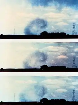 A distinction can be made between a wet microburst which consists of precipitation and a dry microburst which typically consists of virga.[2] They generally are formed by precipitation-cooled air rushing to the surface, but they perhaps also could be powered by strong winds aloft being deflected toward the surface by dynamical processes in a thunderstorm (see rear flank downdraft).