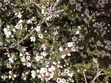 Micromyrtus blakelyi is a spreading shrub in the myrtle family. It is found near the Hawkesbury River, north of Sydney. It usually grows in depressions and crevices in Hawkesbury Sandstone.[1] The shrub grows to a height of 0.3 to 0.6 metres, and has a cushion-like appearance. Flowering occurs from August to October (early Spring). It is a rare plant, listed in New South Wales as vulnerable.[2] The shrub was first collected by botanists in 1958, and it was named in honour of William Faris Blakely.