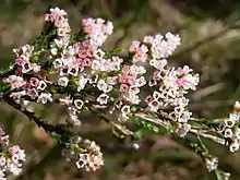 Micromyrtus ciliata is a small spreading shrub in the myrtle family. It is often seen growing to less than half a metre tall, in coastal heathland of poor quality soils derived from sandstone.[1] Small flowers occur from spring to early summer. The specific epithet ciliata refers to a fringe of hairs. This plant first appeared in scientific literature in the year 1797, published by the eminent English botanist James Edward Smith. Since then it has undergone a large number of taxonomic changes.[2]
