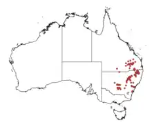 This species occurs between Miles in Queensland and Griffith in New South Wales, mainly above 600 m (2,000 ft), in a range of habitats from mallee to forest, often in rocky places.[2][3]