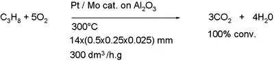 The combustion of propane was demonstrated to occur at temperatures as low as 300 °C in a microchannel setup filled up with an aluminum oxide lattice coated with a platinum / molybdenum catalyst:[12]