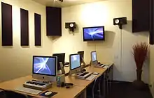 The Audio in Media six-month programme is divided into three terms. Terms 1 and 2 include initial subjects of study such as acoustics, psychoacoustics, ear training and audio production equipment components such as audio production consoles, microphones, recording media and signal processors. Delivery of curriculum includes both theoretical introduction to subjects followed by hands-on work within three dedicated in school production rooms. Term 3 (Practicums) requires students to complete audio production projects such as music multi-track recording, radio jingle production and sound design for video. Students also complete a Live Sound module hosted by a local Venue with a live band.[3]