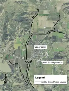 Upper Lake experienced severe flooding in 1938, 1955 and 1957–1958.[14] In 1954 the US Congress authorized the Middle Creek Project by the US Army Corps of Engineers to protect the community of Upper Lake and about 4,000 acres (1,600 ha) of agricultural land from flooding by the Middle, Scotts and Clover creeks. The project included 14.4 miles (23.2 km) of levees, diversions structures and a pumping station. It was completed in 1966. The state provided routine maintenance, flood fighting, levee patrolling and channel maintenance.[17] The levees suffered from erosion and subsidence, and rather than giving 100-year protection as designed by 2000 were giving only 4-year protection.[18]