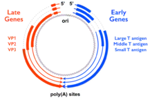 The genes for the small tumor antigen (STag), middle tumor antigen (MTag), and large tumor antigen (LTag) are encoded in the "early region" of the polyomavirus genome, so named because this region of the genome is expressed early in the infectious process. (The "late region" contains genes encoding the viral capsid proteins.) In MTag-containing polyomaviruses, the early region contains at least three genes encoding STag, MTag, and LTag, and is transcribed as a single messenger RNA processed by alternative splicing. The LTag gene is usually encoded in two exons, of which the first overlaps with the genes for STag and MTag. The result of this genetic encoding is three proteins that share a common N-terminal sequence, forming a protein domain called the J domain which has sequence homology to DnaJ molecular chaperone proteins. MTag and STag share an additional ~100 amino acid residues and have distinct C-termini. The full-length MTag protein is around 420 amino acids long.[1][3]