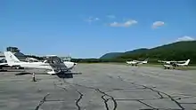 The aircraft parking aprons at the facility are approximately 87,000 ft2[4] and encompass approximately 170,000 ft2 of area.[5] The principal apron is located northwest of Runway 19 and has the capacity to hold 42 aircraft. The secondary apron is located in front of the terminal building and has the capacity for 10 aircraft. A small fueling apron is located between the two parking aprons. Aircraft tie-down spaces are leased by the facility's FBO from the State of Vermont.