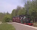 Steam was reintroduced in 1866 with tank engines from local firm Manning Wardle. In 1881 the railway was converted to 4 ft 8+1⁄2 in (1,435 mm) standard gauge allowing it to connect with the Midland Railway. Other extra links included one to the Great Northern Railway in 1899 and sidings serving other sources of freight including Robinson & Birdsell's scrapyard and Clayton, Sons & Co's engineering works.[7] The Middleton Estate & Colliery Co became part of the nationalised National Coal Board in 1947. Some rationalisation took place, the city centre staith at Kidacre street was closed and in the end coal movement was concentrated on the stretch of line from the GNR connection to Broom Pit. Preservationists mainly from Leeds University were allowed to move into an abandoned part of the line, between Moor Road and the GNR connection, by its then owners Messrs. Clayton, Son & Co. When Broom Pit closed in 1968 the preservationists, by then called the Middleton Railway Trust, were able to reinstate the connection and operate to the site of Broom Pit, maintaining the continuous operation of the line.[8]