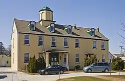 The school building was constructed in two phases. The original building was a five bay, two and half story structure topped with an octagonal belfry (since converted into a closed cupola).[4] The exterior walls are brick covered in stucco, the result of a trip to Philadelphia by a trustee sent to investigate the possibility.[4][5] An annex was constructed around 1872, also of brick but painted rather than stuccoed.[4] Both the annex and the original portion feature round-headed dormers to light the attic.[4] There are three rooms on each floor and a central hall in the original section. This layout remains unchanged though the interior has been updated considerably over the years to accommodate the various tenants.[4]