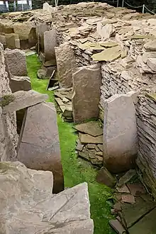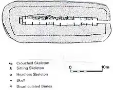 Midhowe represents an example of collective burial common to the Orkney-Cromarty tombs.[15] The remains of at least 25 individuals were discovered in the tomb. Seven of the twelve chambers have side shelves- the bodies were found in groups of two to four on six of the shelves.[15] Several of the skeletons were in a crouched position on the shelves, with their backs to the side wall and heads resting against the supporting pillars. Other groups of bones had been heaped into the centers of the shelves or swept under them, suggesting that earlier burials had been moved to accommodate later ones.[15] In a few cases only the skulls were present, in one instance the long bones had been piled together with the skull placed on top.[16]
