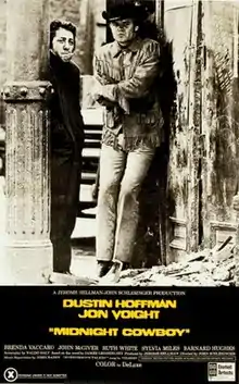 Midnight Cowboy is a 1969 American buddy drama film, based on the 1965 novel of the same name by James Leo Herlihy. The film was written by Waldo Salt, directed by John Schlesinger, and stars Dustin Hoffman and Jon Voight, with notable smaller roles being filled by Sylvia Miles, John McGiver, Brenda Vaccaro, Bob Balaban, Jennifer Salt, and Barnard Hughes. Set in New York City, Midnight Cowboy depicts the unlikely friendship between two hustlers: naïve sex worker Joe Buck (Voight), and ailing con man Enrico "Ratso" Rizzo (Hoffman).