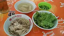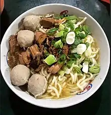 Mie ayam, mi ayam or bakmi ayam (Indonesian for 'chicken bakmi', literally chicken noodles) is a common Indonesian dish of seasoned yellow wheat noodles topped with diced chicken meat (ayam).[3][4] It is derived from culinary techniques employed in Chinese cuisine.[5][6] In Indonesia, the dish is recognized as a popular Chinese Indonesian dish,[5] served from simple travelling vendor carts frequenting residential areas, humble street-side warung to restaurants.