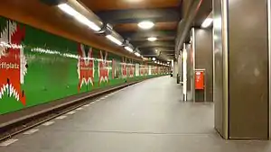 Architect Rümmler designed this station walls like the pattern of a M as in Mierendorffplatz. The next station is Richard Wagner Platz.[2]