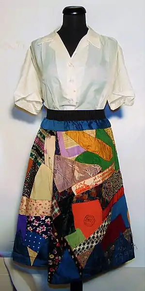 After the war, Boissevain-van Lennep belonged to a women's group that wanted to commemorate the postwar rebuilding of the Netherlands.[2] Mies came up with the idea for a garment she termed the national liberation skirt (nationale feestrok: a 'feestrok' is a celebration or party skirt).[3] Also known as 'liberation skirts' (bevrijdingsrok), these skirts were handmade of colorful patchwork with embroidery.[2][3]