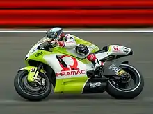 On 19 October 2008, Kallio was announced as part of the new Pramac Racing lineup for the 2009 MotoGP season, riding alongside Italian Niccolò Canepa. Kallio was provided with the latest spec Ducati Desmosedici GP9 ensuring equality for the satellite teams and the factory squad.[13] His MotoGP career started brightly with two 8th places from the opening two rounds at Qatar and Motegi. He then retired from the races in Jerez and Le Mans, before a 13th place in Mugello, and a 9th place in Barcelona. During much of the season however would be blighted with several accidents, most notably at the race in Assen, where Kallio crashed out of 6th place and burnt his finger down to the bone, losing the top section.[14] He missed the race at Laguna Seca Raceway,[15] being replaced by Aleix Espargaró, but was back in action at the Sachsenring in Germany, racing with a special custom-made glove to accommodate the bandage.