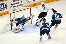 In 1999, Modano won the Stanley Cup with the Stars, playing all six games of the finals against the Buffalo Sabres despite breaking his wrist in the second game.[5] Modano assisted on the Stars' final five goals of the series, including both in Game 5 and Game 6, and final goal. Led the Stars with 23 points in the playoffs, with all seven in the finals on assists.[8] The Stars returned to the finals in 2000 against the New Jersey Devils. Modano scored the overtime goal that gave the Stars a victory in game 5,[9] but in game 6 in Dallas, the Devils wound up closing the series 4–2.[10]