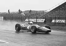Parkes first entered a World Championship Grand Prix at Aintree in 1959 driving a Formula 2 (F2) Fry-Climax 1.5-litre Straight-4. However he did not qualify and returned to sportscars thereafter, apart from a single outing at Mallory Park in 1962 with a Bowmaker Cooper.[2] Following his success with Ferrari sportscars, Parkes joined Ferrari officially, in 1963 as development and reserve driver,[2] and over the following seasons became recognised as a leading sports car driver.[2] When John Surtees unexpectedly left Ferrari in 1966, Parkes was promoted to the Grand Prix team and with an extended chassis to accommodate his height of six feet four inches,[2] was immediately successful, finishing in second place in the 1966 French Grand Prix at Reims. Jack Brabham won the race with his teammate, Denny Hulme, third, in their Brabham–Repcos.[13] However this was followed by two retirements before another second place at Monza where he also took pole position.[2] Parkes won an international Formula One race at Silverstone by one third of a lap over Brabham in April 1967.The 52 lap race was the first Formula One contest for Parkes in his native country. He completed the 152.36 mile competition in 1:19:39.25 with an average speed of 114.65 m.p.h.[14] In 1967, Parkes competed in two further Grands Prix for Ferrari finishing fifth at Zandvoort but retiring through accident at Spa,[2] after sliding on oil being sprayed from Jackie Stewart's H16 BRM,[15] on the first lap, suffering broken legs that would ultimately end his Grand Prix career. Ferrari Auto Works entered two cars in the 1967 Syracuse Grand Prix. This was a Formula One race that did not count toward the Formula One World Championship. Parkes and Scarfiotti were assigned 1966 model single seaters.[16] After Parkes' Formula One career ended, he raced into the 1970s in sports cars.