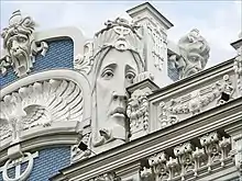 The facade of Elizabetes iela 10b was based on patterns and drawings published by two Leipzig-based architects, G. Wünschmann and H. Kozel.[20] The building on Alberta iela 10a was originally designed by Eižens Laube but the facade was rebuilt in 1903 by Eisenstein, containing elements which may have been inspired by the Secession Building in Vienna by Joseph Maria Olbrich.[21] The building on Alberta iela number 4 (1904), also commissioned by Lebedinsky, is more ornamentally restrained with a facade dominated by contrastic window shapes and several large sculptures, including two standing lions elevated above the roof on pedestals at the corners, Medusa heads and reliefs of lions or griffins flanking the entrance.[22] It has been described as one of the most distinctive of Eisenstein's facades, together with the building on 2a.[11]