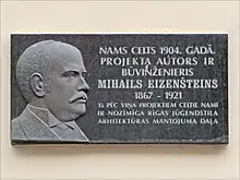Mikhail Osipovich Eisenstein (Russian: Михаил Осипович Эйзенштейн, romanized: Michail Osipovič Ejzenštein, Latvian: Mihails Eizenšteins; 17 September [O.S. 5] 1867 – 2 July 1920) was a civil engineer and architect working in Riga, the present-day capital of Latvia, when the city was part of the Russian Empire. He was active as an architect in the city at a time of great economic expansion and consequent enlargement, which coincided with the flourishing of Art Nouveau architecture. During the years 1901–1906, Eisenstein designed many of the best-known Art Nouveau buildings of Riga. His son, Sergei Eisenstein, became a well-known Soviet film director.