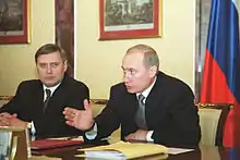 Mikhail Mikhailovich Kasyanov (Russian: Михаи́л Миха́йлович Касья́нов, IPA: [mʲɪxɐˈil mʲɪˈxajləvʲɪtɕ kɐˈsʲjanəf]; born 8 December 1957) is a Russian politician who served as Prime Minister of Russia from 2000 to 2004. Previously, he had served as First Deputy Prime Minister in 2000 and Minister of Finance from 1999 to 2000. During the 1990s, he worked in President Boris Yeltsin's administration in different positions before joining President Vladimir Putin's first administration. Since leaving the government over disagreements on economic policy, he has become one of the leading critics of President Putin and an opposition leader.