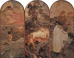 Later Vrubel participated in the All-Russia Exhibition 1896 dedicated to the Coronation of Nicholas II and Alexandra Feodorovna. Savva Mamontov was a curator of the exposition dedicated to the Russian North. It was him who noticed that the neighbouring section of arts lacks the paintings that would cover two large empty walls. Mamontov discussed with the Minister of Finance his idea to cover these walls with large panels with total area 20 × 5 m and ordered these panels from Vrubel.[103] At that time, the painter was busy decorating the Morozov's mansion in Moscow. However, he agreed to take the offer even though the order was quite big – the total area of paintings was 100 square meters, and it needed to be finished in three months.[104] He planned to decorate the first wall with the painting "Mikula Selyaninovich" that metaphorically depicted the Russian land. For the second wall, Vrubel chose "The Princess of the Dream" inspired by a work of the same name made by the French poet Edmond Rostand. The second painting symbolically represented the painter's dream of beauty.[105]