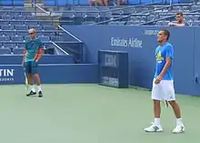 Boris Sobkin was Youzhny's coach since the age of 10 because of Youzhny's father's interference.[3] His fitness trainer is Oleg Mosiakov.[97] Youzhny wore adidas clothing and Barricade 7.0 shoes and used a Head Head Graphene XT Extreme Pro racquet.[98]